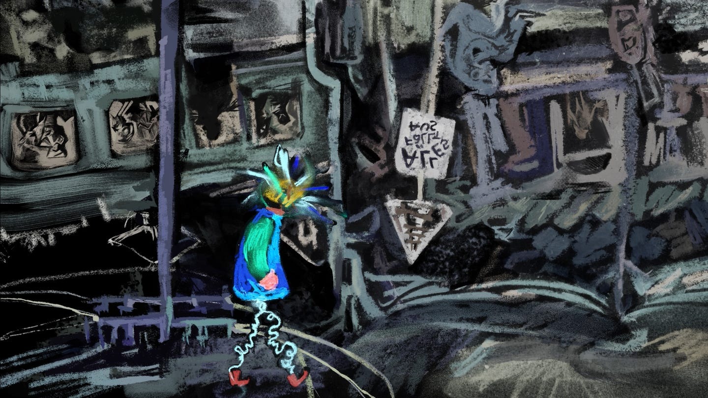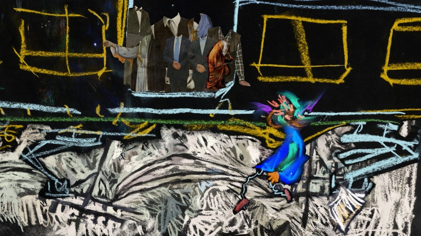 Людина чекає на вокзалі. Зі шматків газет намагається скласти зв'язну історію та відповісти на питання, як можна жити під час масштабних катастроф і продовжувати вигулювати собаку.